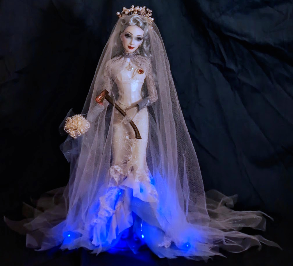 11" chines fake doll fully repainted with acrylic paints Handmade costume. Dark Siren is a doll for the Halloween doll show of the Repaint Society: Monster Mash.
